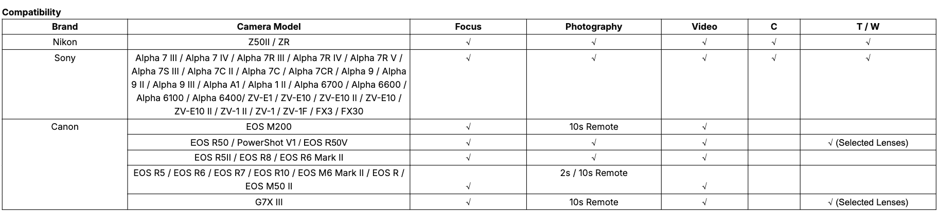 Sony: α9 II,ZV-1,FX30,α7C,α1,FX3,α7R IV,ZV-E1,FX2,ZV-1 II,α9,α7S III,α6700,α6600,α6400,α6100,ZV-E10,α9 III,ZR,α7 IV,α7C II,ZV-1F,α7R III,α7CR,α1 II,α7R V,ZV-E10 II.